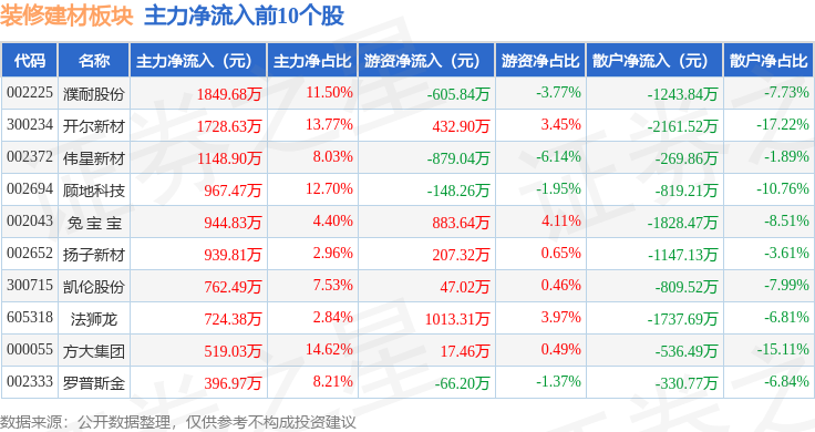 从资金流向上来看,当日拆建筑材板块从力资金净流出1。67亿元,逛资资金净流入1。58亿元,散户资金净流入886。5万元。拆建筑材板块个股资金流向见下表?。